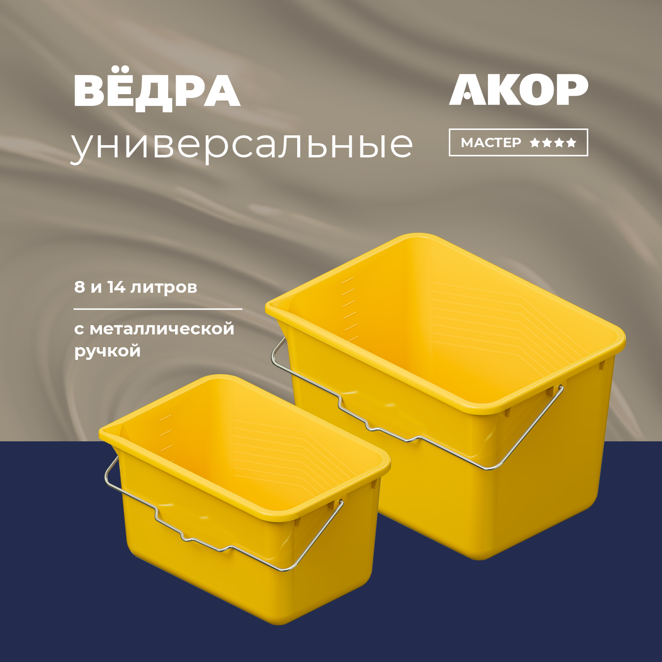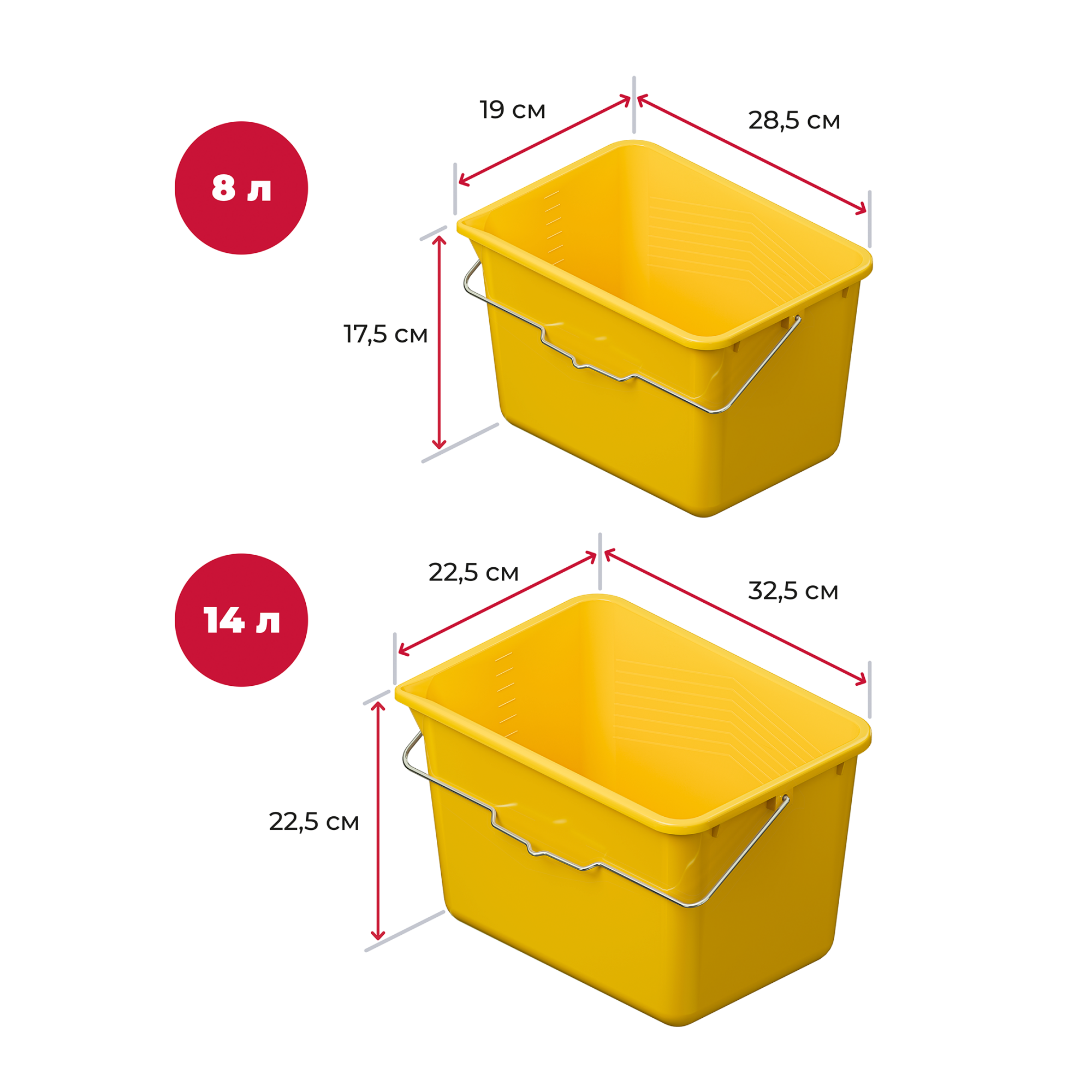Ведра желтые 8 л и 14 л подходят для профессиональных работ, с применением различных размеров валиков и кистей. Отличный вариант для смешивания лакокрасочных материалов, приготовления растворов, а также для хранения и переноса различных предметов. Изготовлены из качественного полипропилена, устойчивого к нагрузкам и воздействию растворителей, что гарантирует долговечность изделия.