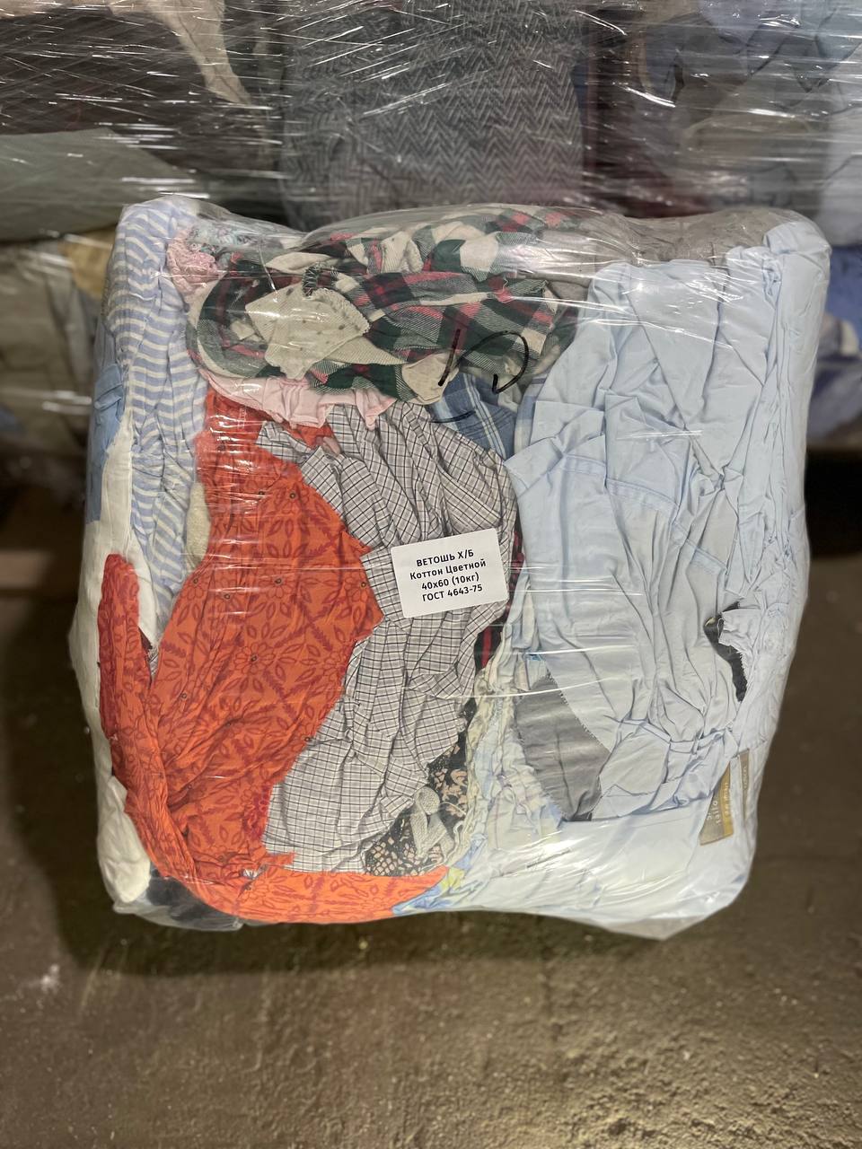 Ветошь цветная х/б размером лоскутов ткани неправильной формы, средний размер 40Х60 см, производится из одежды секонд-хенд (рубашки, платья, сарафаны, сорочки, тонкие юбки, брюки, халаты, салфетки), исключительно только из тонкой и средней толщины хлопчатобумажных тканей (ситец, бязь, сатин). При переработке одежды срезаются пуговицы, фурнитура, молнии и т. д. Данная хлопчатобумажная ткань имеет важное свойство- не оставляет ворс. Ткань прекрасно впитывает и отлично подходит для обработки поверхностей под окраску, а так же других производственно-промышленных направлений.