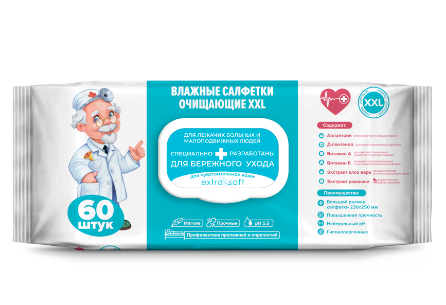 Влажные очищающие большие салфетки 230х250 мм для ухода и обработки лежачих больных и малоподвижных людей «Эко» - 60 и 120 штук. Влажные салфетки предназначены для ухода и обработки малоподвижных и лежачих больных. Удобны для бережной очистки кожи без использования воды и моющих средств. Подходят для чувствительной кожи, не вызывают раздражений и покраснений, не имеют в составе спирта и парабенов. Мягкая основа салфеток специально разработана для нежного и деликатного очищения, при этом они не рвутся и не оставляют ворсинок. Содержащийся в составе пропитывающего раствора Аллантоин - стимулирует регенерацию тканей, Д-пантенол - оказывает заживляющее действие, Витамин А - ускоряет восстановление целостности кожного покрова, Витамин Е - оказывает ранозаживляющее и противовоспалительное действие, Экстракт алоэ вера обладает противовоспалительным действием, Экстракт ромашки оказывает противомикробное действие.