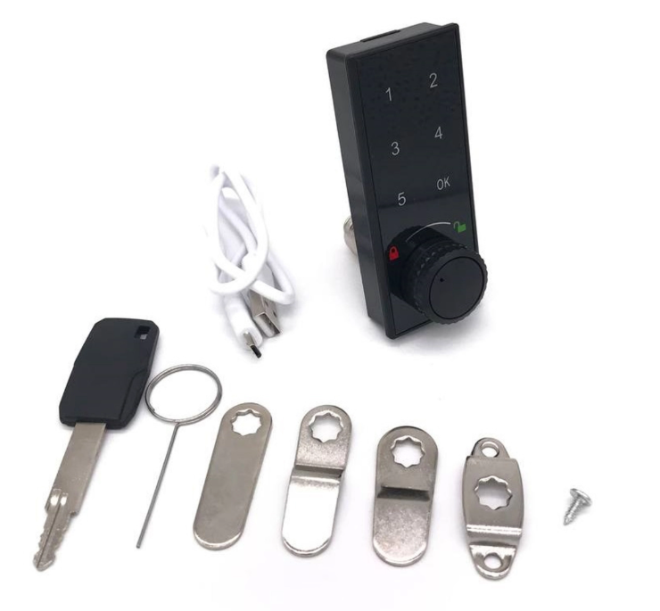 Замок поворотный электронный, тип запирания - кодовый + ключ в комплекте, в комплекте набор ригель, USB-провод для подзарядки