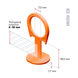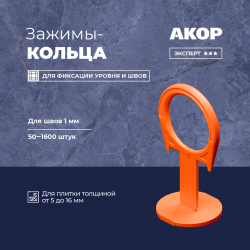 Оранжевые зажимы-кольца (СВП) для швов в 1 мм. Гибкие, не ломаются при монтаже. Легко установить указательным и большим пальцами. Демонтируются легким ударом киянкой по ребру. Подходят для плитки, керамогранита и мрамора толщиной от 5 до 16 мм. Расфасованы по 50–1600 шт. Для монтажа рекомендуем применять клинья и щипцы производства «АКОР».