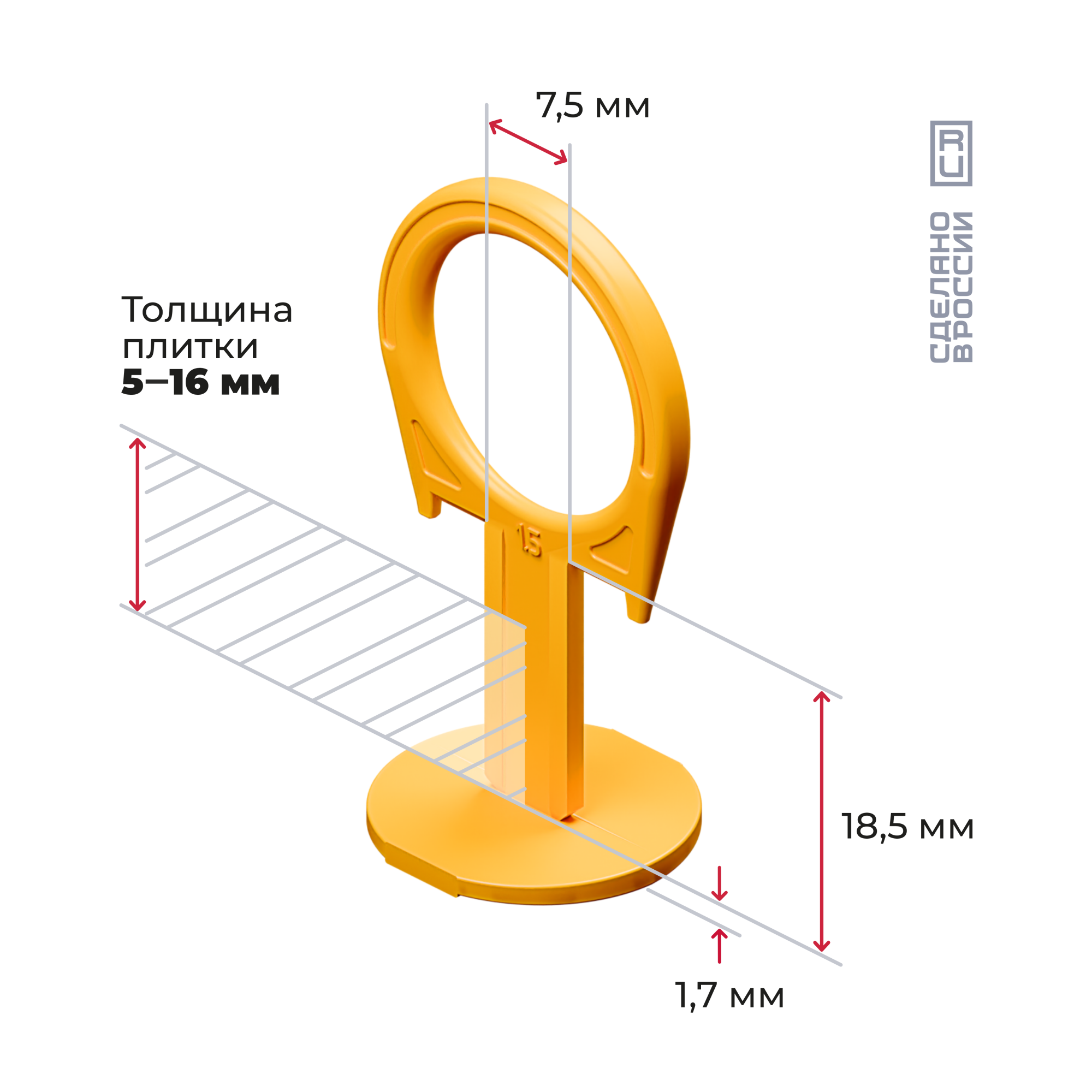 Желтые зажимы-кольца (СВП) для швов в 1,5 мм. Гибкие, не ломаются при монтаже. Легко установить указательным и большим пальцами. Демонтируются легким ударом киянкой по ребру. Подходят для плитки, керамогранита и мрамора толщиной от 5 до 16 мм. Расфасованы по 50–1600 шт. Для монтажа рекомендуем применять клинья и щипцы производства «АКОР».