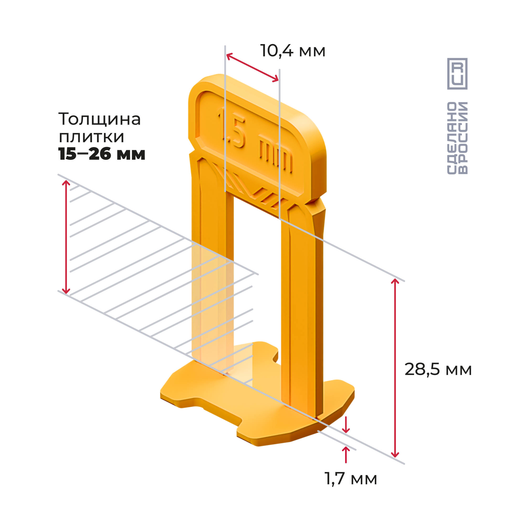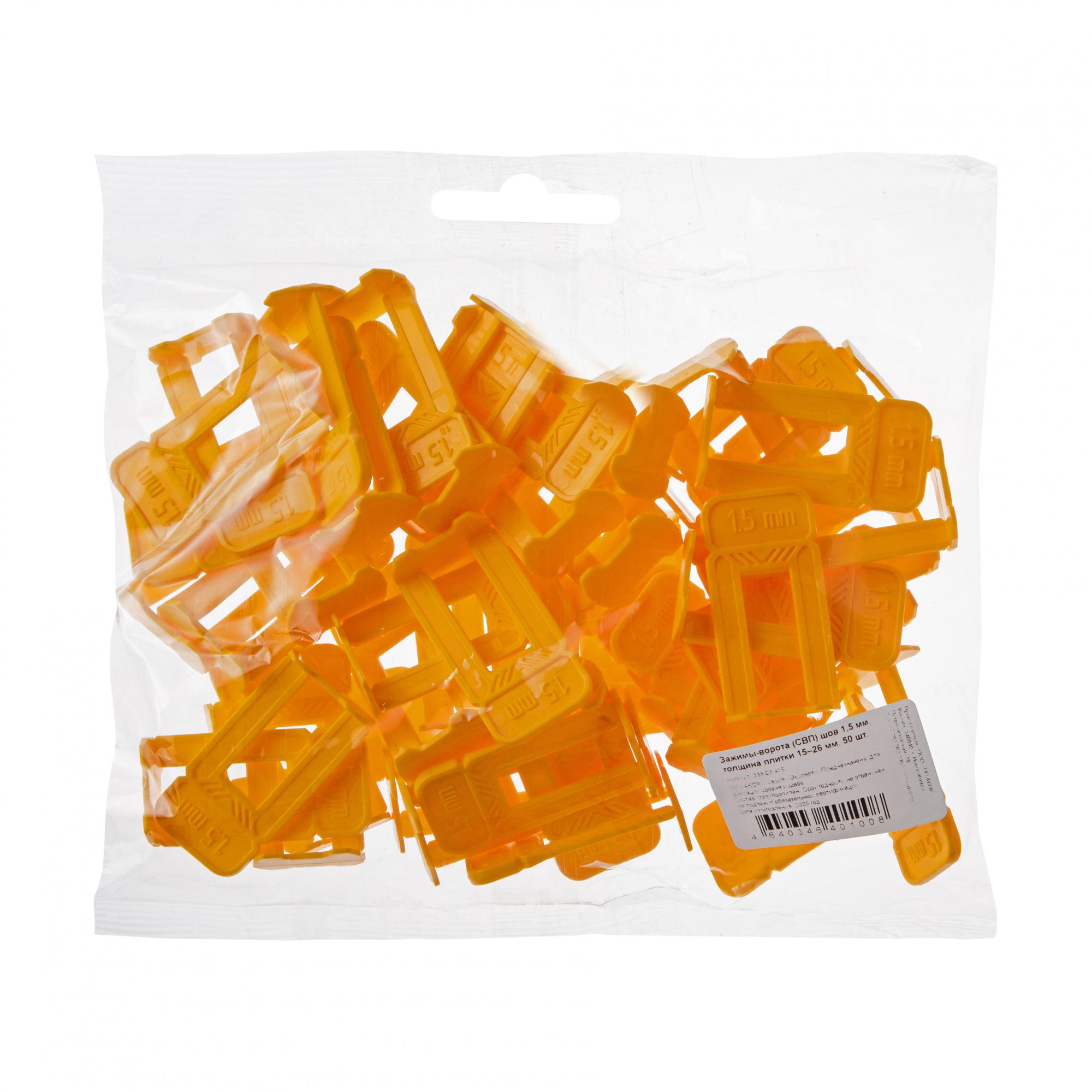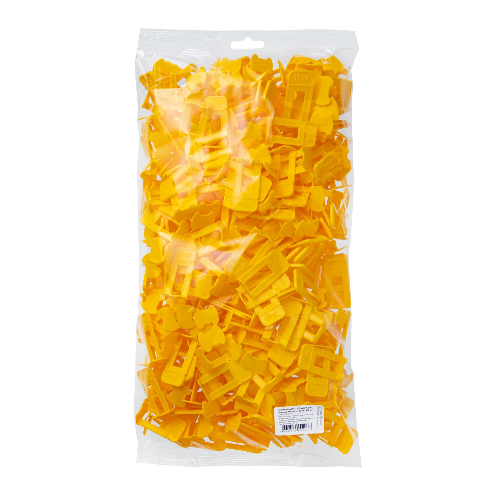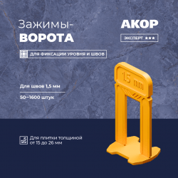Желтые зажимы-ворота (СВП) для швов в 1,5 мм. Гибкие, не ломаются при монтаже. Демонтируются легким ударом киянкой по ребру. Подходят для плитки, керамогранита и мрамора толщиной от 15 до 26 мм. Расфасованы по 50–1600 шт. Для монтажа рекомендуем применять клинья и щипцы производства «АКОР».