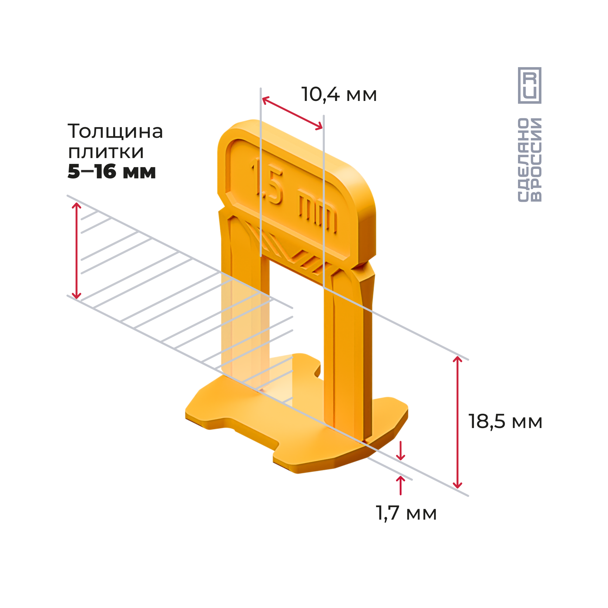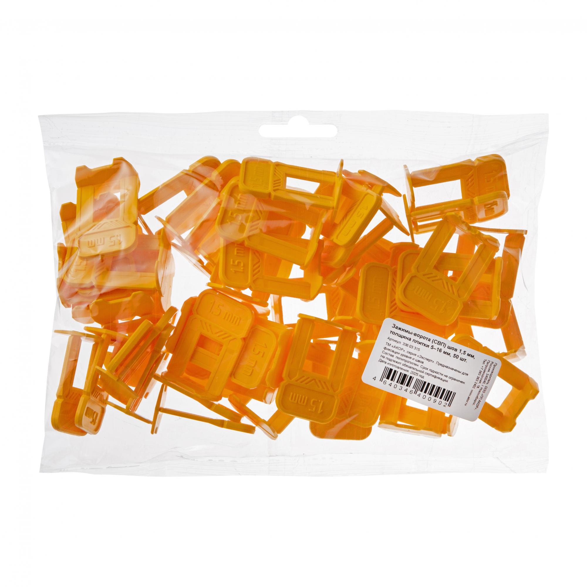 Желтые зажимы-ворота (СВП) для швов в 1,5 мм. Гибкие, не ломаются при монтаже. Демонтируются легким ударом киянкой по ребру. Подходят для плитки, керамогранита и мрамора толщиной от 5 до 16 мм. Расфасованы по 50–1600 шт. Для монтажа рекомендуем применять клинья и щипцы производства «АКОР».