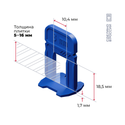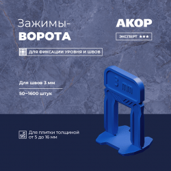Синие зажимы-ворота (СВП) для швов в 3 мм. Гибкие, не ломаются при монтаже. Демонтируются легким ударом киянкой по ребру. Подходят для плитки, керамогранита и мрамора толщиной от 5 до 16 мм. Расфасованы по 50–1600 шт. Для монтажа рекомендуем применять клинья и щипцы производства «АКОР».