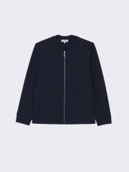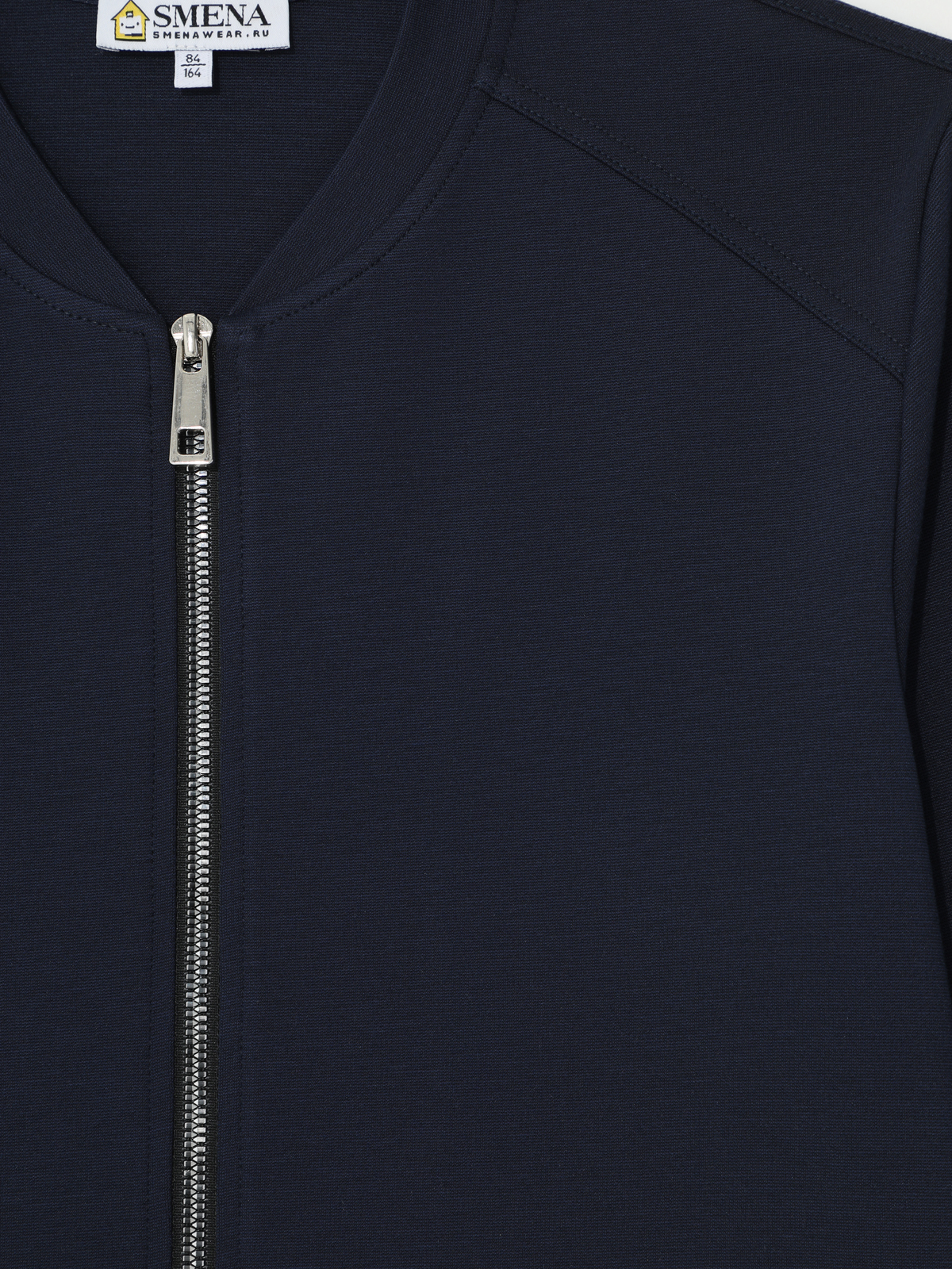 Классический трикотажный бомбер для мальчика из смесовой вискозы свободного силуэта с воротником-стойкой и длинным втачным рукавом. Дополнен карманами в боковых швах. Манжеты на рукавах и низ бомбера оформлены резинкой. Застёгивается на металлическую молнию.