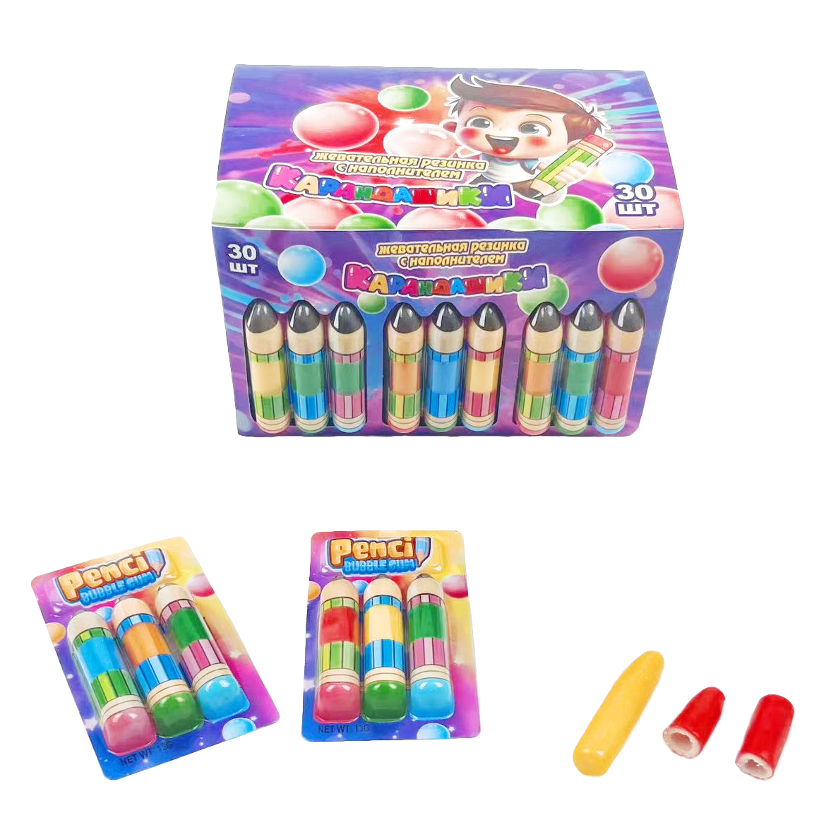 Жевательная резинка «Карандашики» — большая жвачка в форме карандаша! В блистер входит 3 разных вкуса — яблочный, банановый и клубничный. Стильный дизайн и безопасный состав.