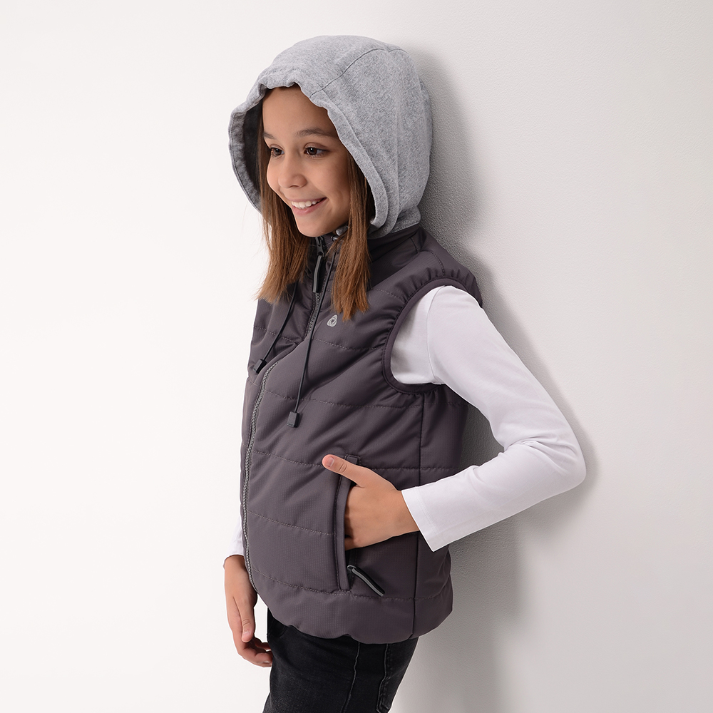 Универсальная модель на любой случай! Теплый, легкий и удобный жилет из ткани понж, со съемным капюшоном из мягкого трикотажа. (Оличная замена шапки) Фронтальная застежка и карманы на молнии. Современный, практически невесомый, утеплитель – термофин 100г./м2 . Пройма и низ жилета окантованы эластичным кантом, чтобы сохранить тепло. Жилет детский Джуниор подходит для мальчиков и девочек и представлен в трёх базовых цветах: красный, синий и серый.