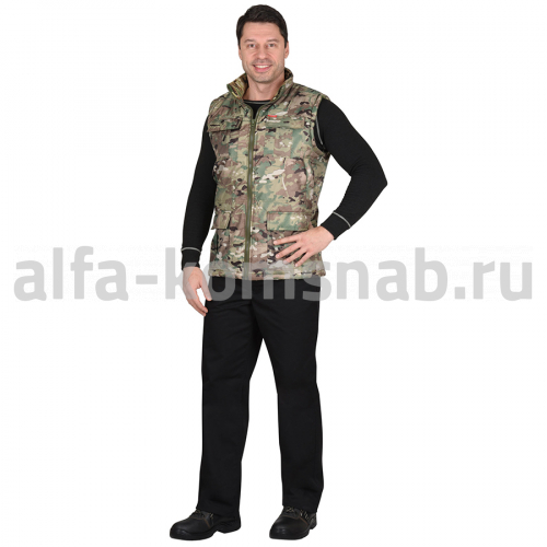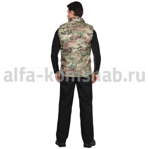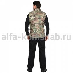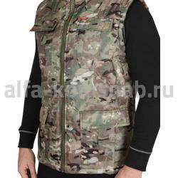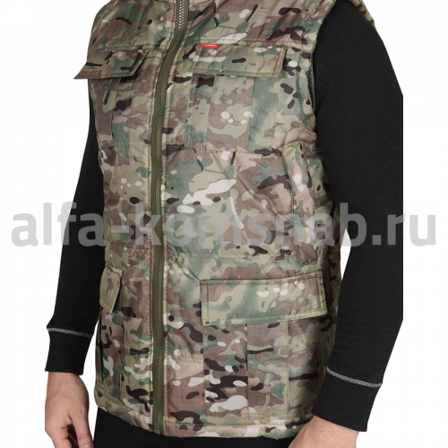 Жилет утеплённый, с воротником, с центральной застёжкой на тесьму "молния" до верха. Полочка с двумя нижними карманами с клапанами, с двумя нагрудными карманами.