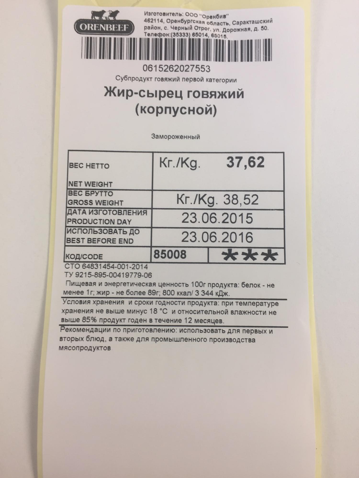 Жир-сырец говяжий корпусной замороженный