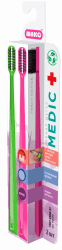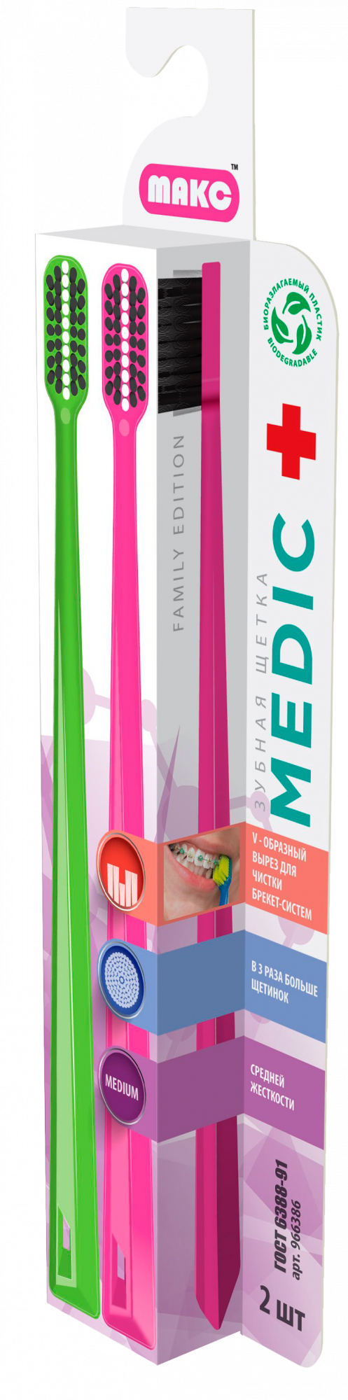 Зубная щетка МЕДИК 2 шт, ДЛЯ БРЕКЕТ-СИСТЕМ, жесткость щетины средняя, цвет зеленый+розовый, биоразлагаемая.