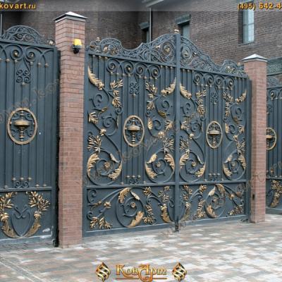 Кованые закрытые ворота с золотыми элементами