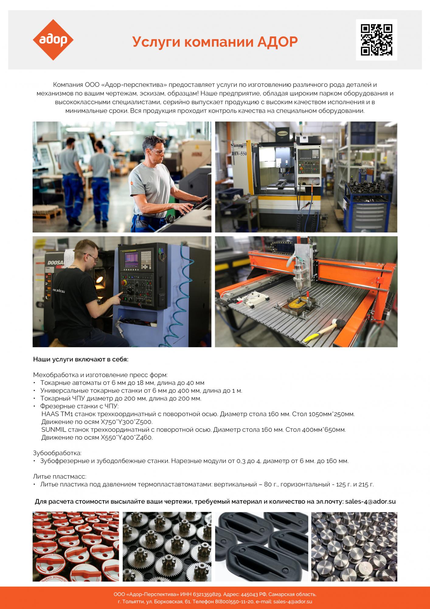Компания ООО «Адор-перспектива» предоставляет услуги по изготовлению различного рода деталей и механизмов по вашим чертежам, эскизам, образцам! Наше предприятие, обладая широким парком оборудования и высококлассными специалистами, серийно выпускает продукцию с высоким качеством исполнения и в